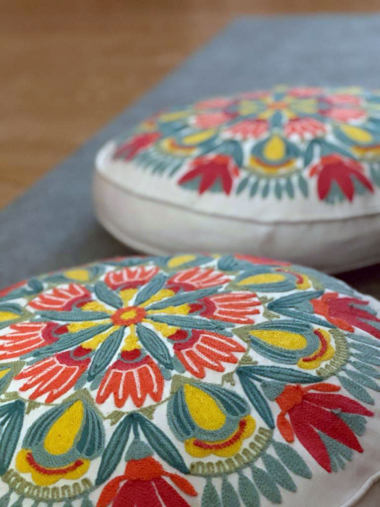 Sehr gemütliches Sitzkissen mit einer vollflächigen Handbestickung.